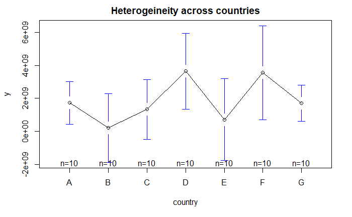 library(gplots) plotmeans(y ~ country, main="Heterogeineity across countries", data=Panel)